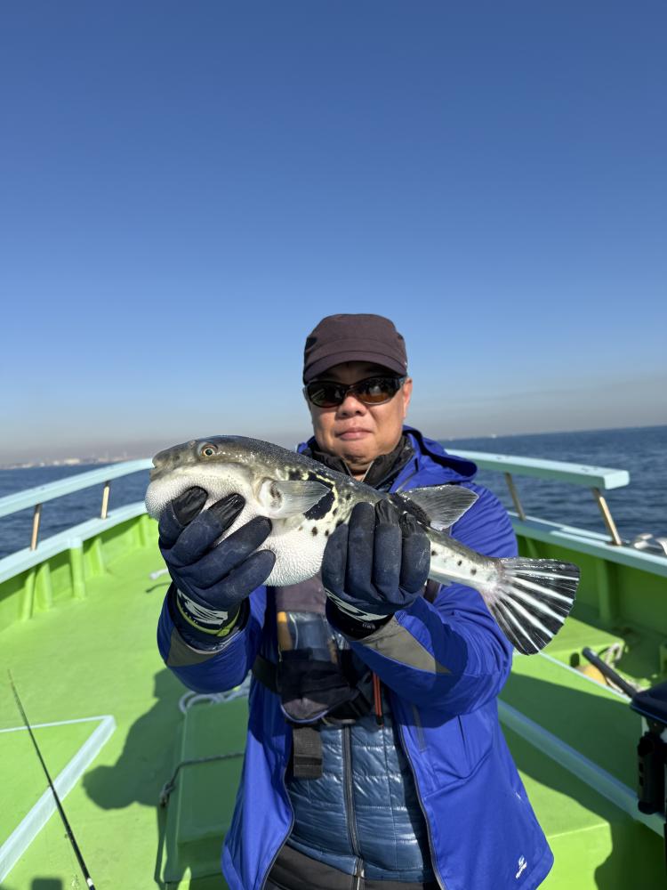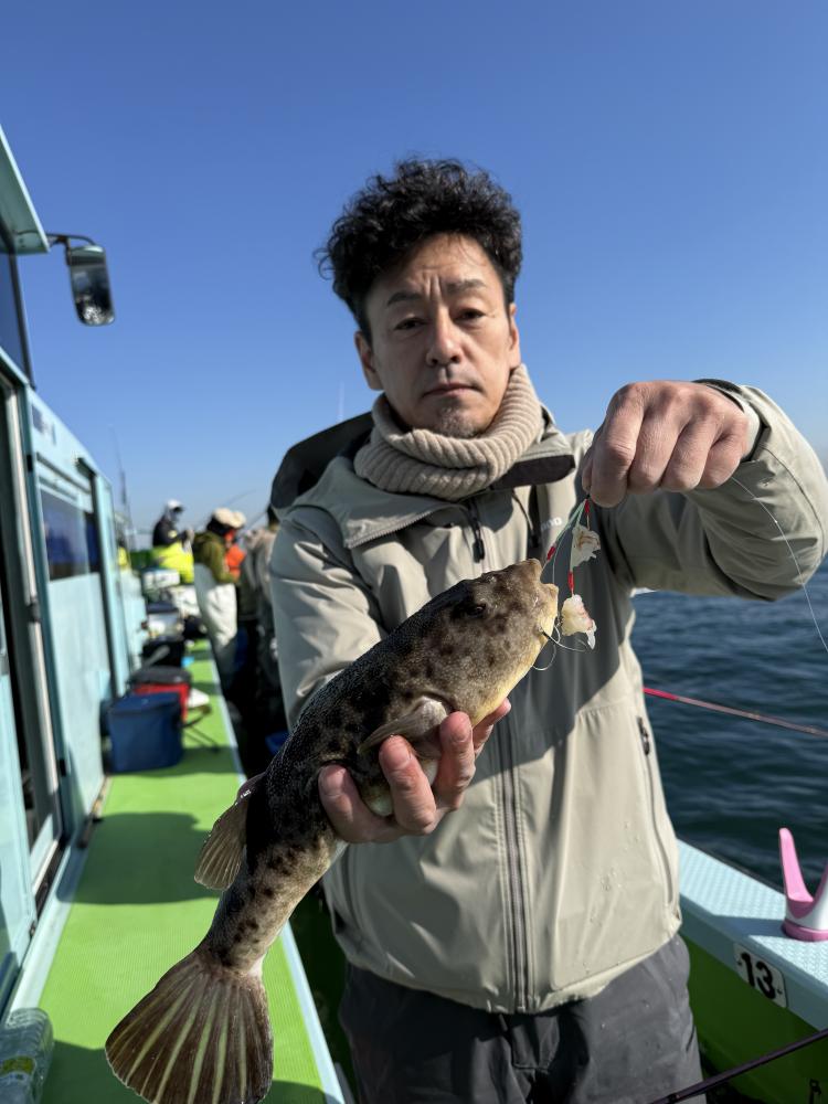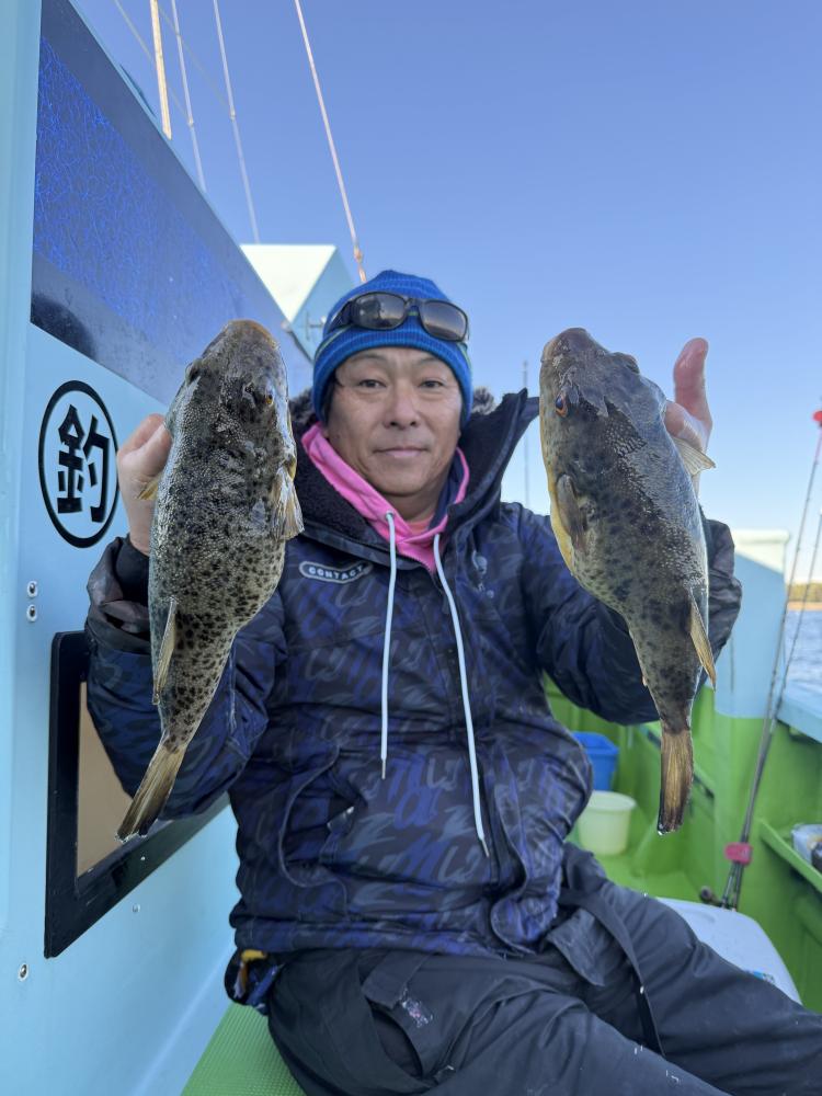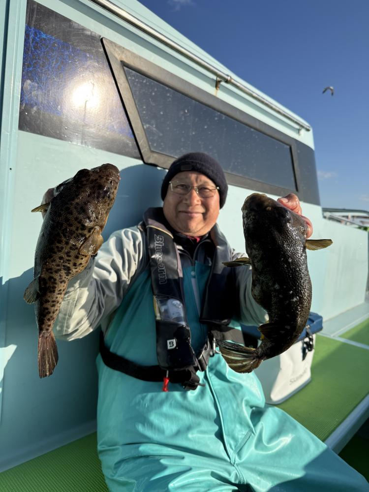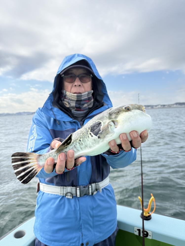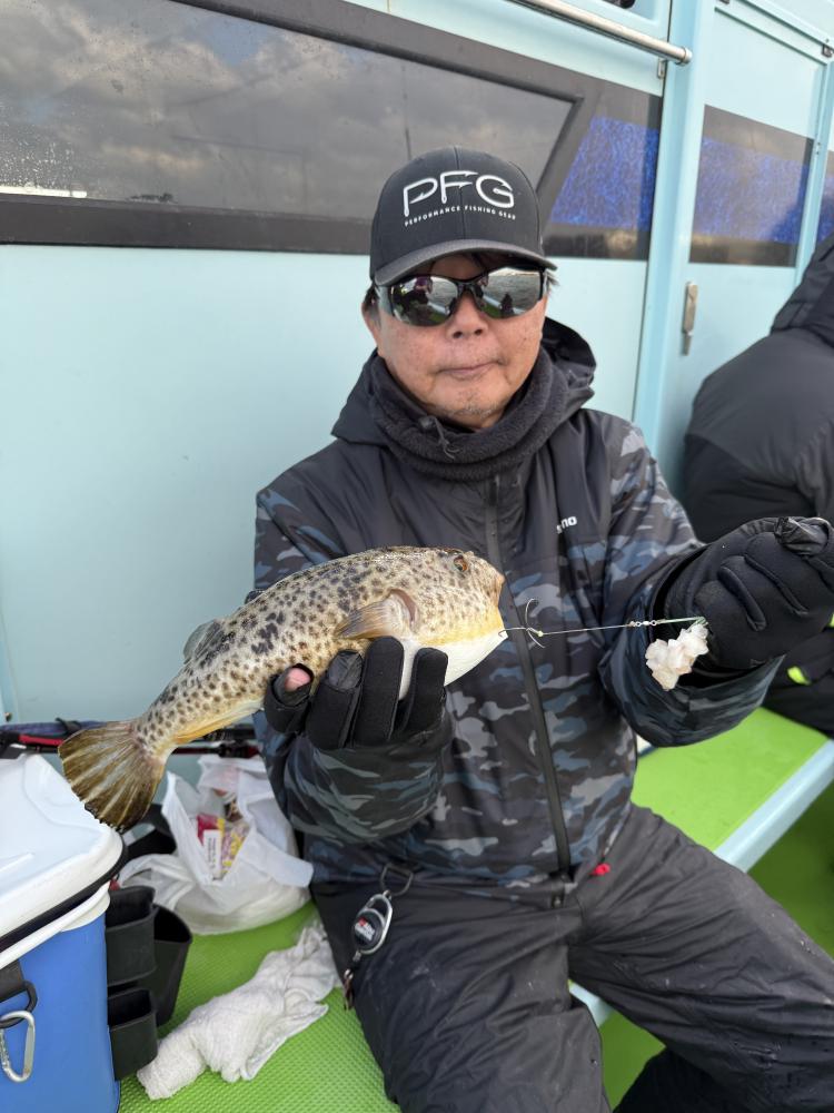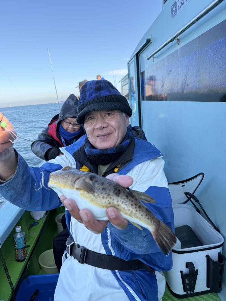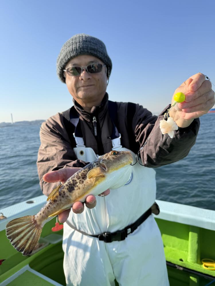 お客様8名で出船しました。一日中ポツポツとアタリ、バレもありましたがトップは10回ヒットで10枚ゲット!1名型を見られず残念でしたが、船中23枚でした。型は1㎏位が多かったです。外道は、ホウボウ、カサゴ、ムシガレイ、トラフグ、ショゴでした。明日は北風が強く出船中止です。明後日は風は収まり出船したいのですが予約は今の所1名です。2名からの出船になりますので、ご予約よろしくお願いします。年老いたキャプテン勇治。
