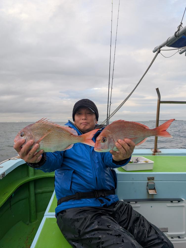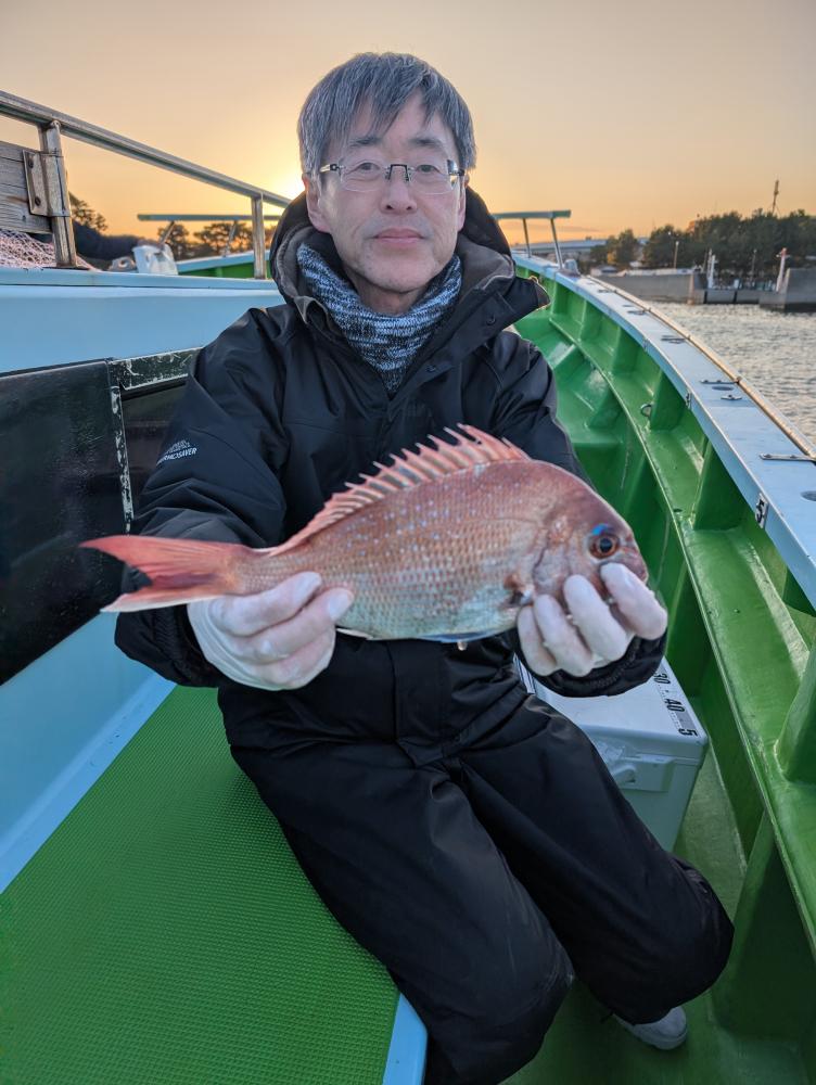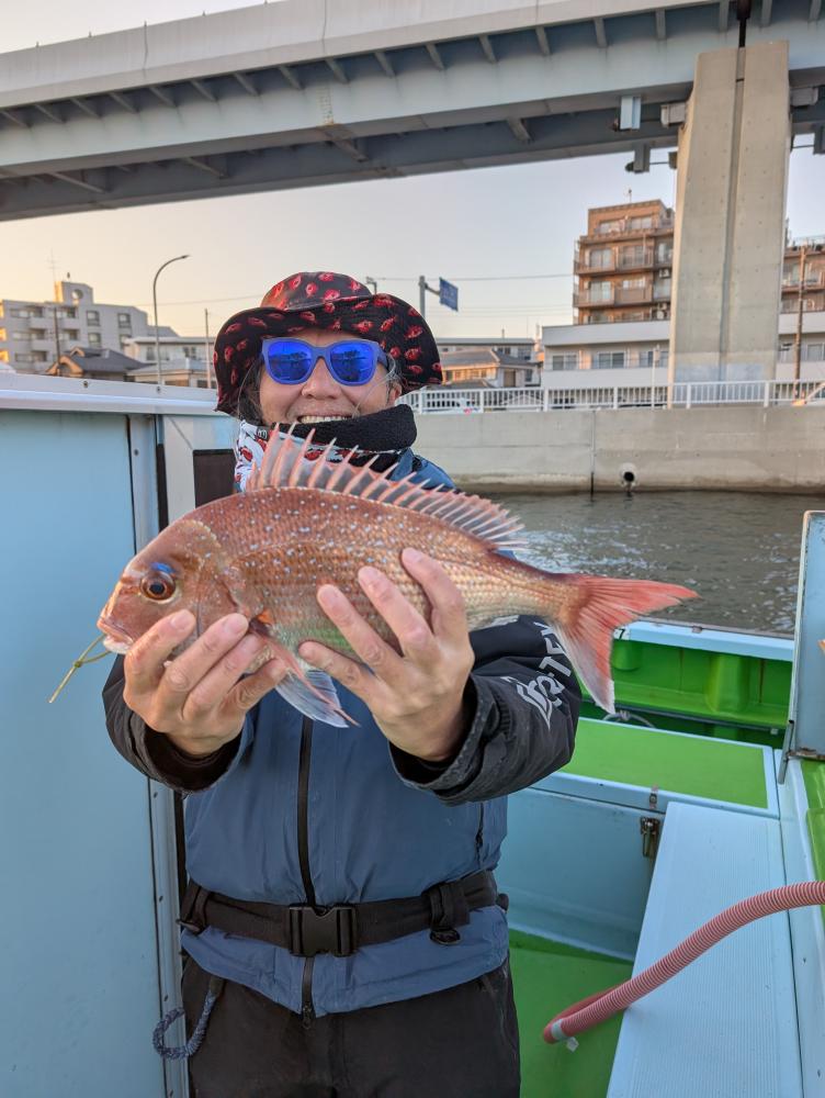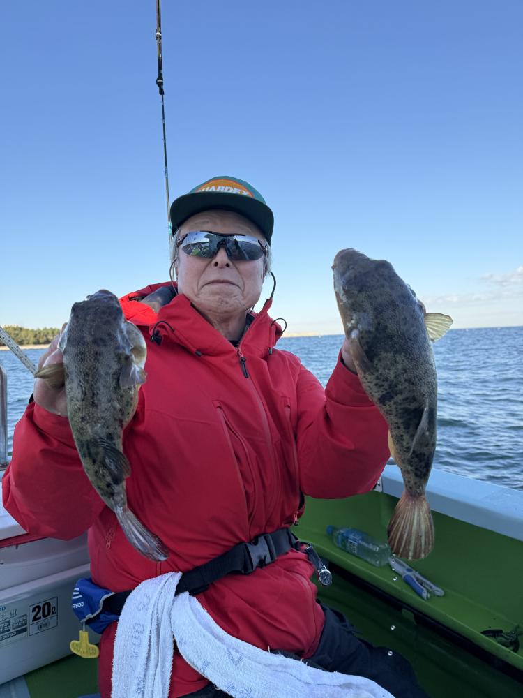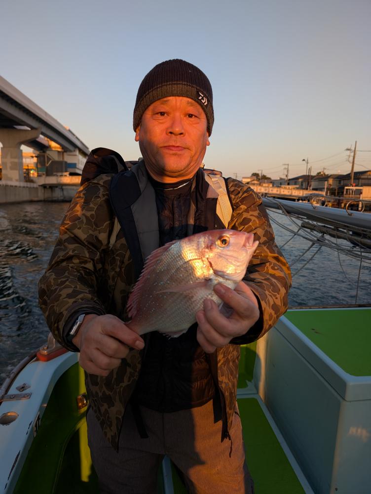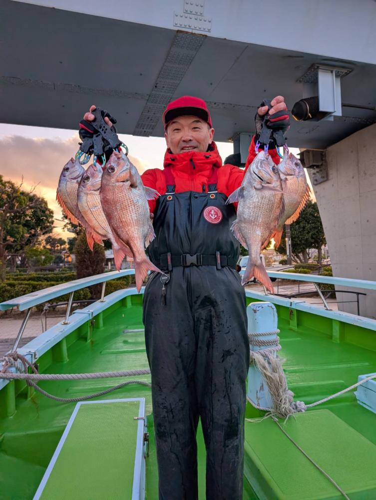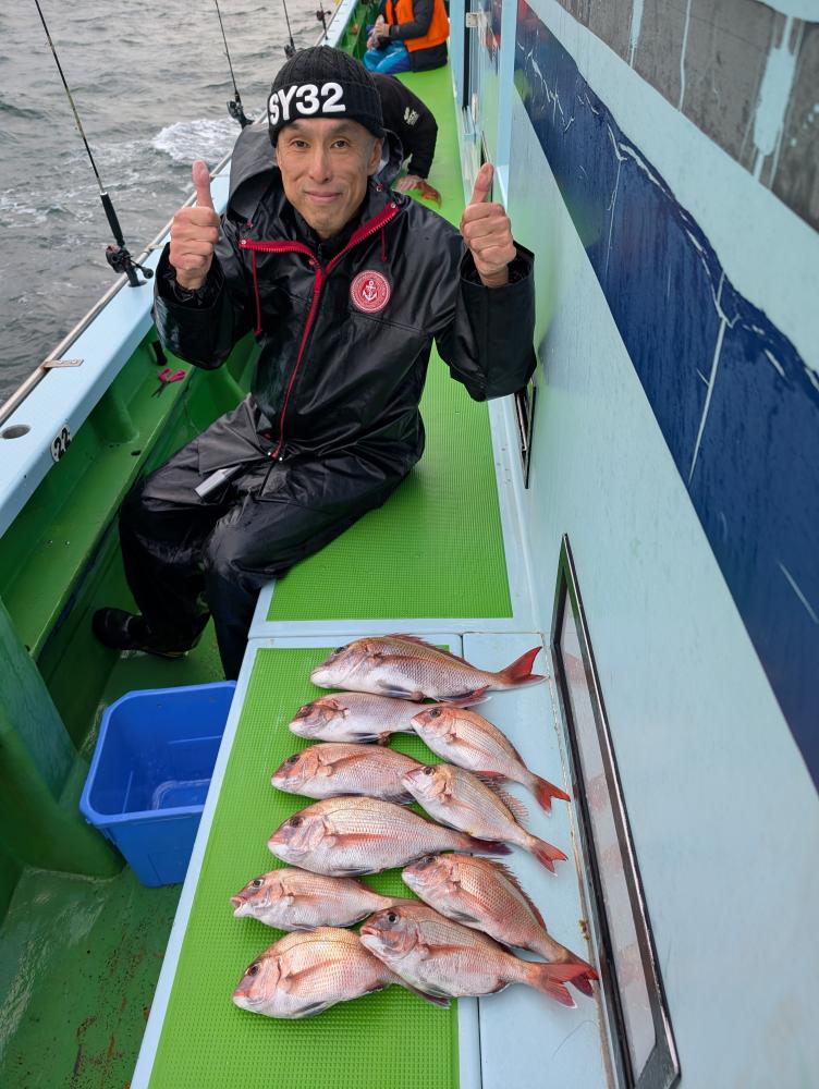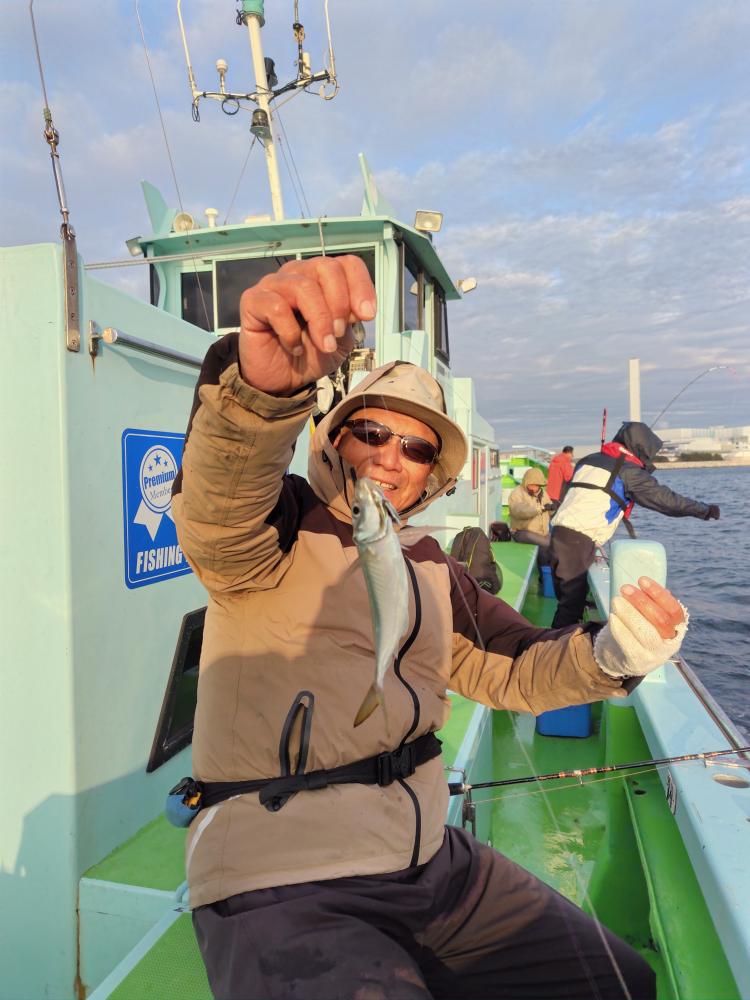 お客様8名で出船しました。一日中ポツポツとアタリ、バレもありましたがトップは10回ヒットで10枚ゲット!1名型を見られず残念でしたが、船中23枚でした。型は1㎏位が多かったです。外道は、ホウボウ、カサゴ、ムシガレイ、トラフグ、ショゴでした。明日は北風が強く出船中止です。明後日は風は収まり出船したいのですが予約は今の所1名です。2名からの出船になりますので、ご予約よろしくお願いします。年老いたキャプテン勇治。
